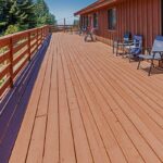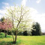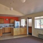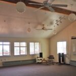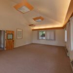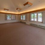 This clean and simple meeting space offers a high ceiling, plenty of windows for natural light, and a large deck with an orchard view.
